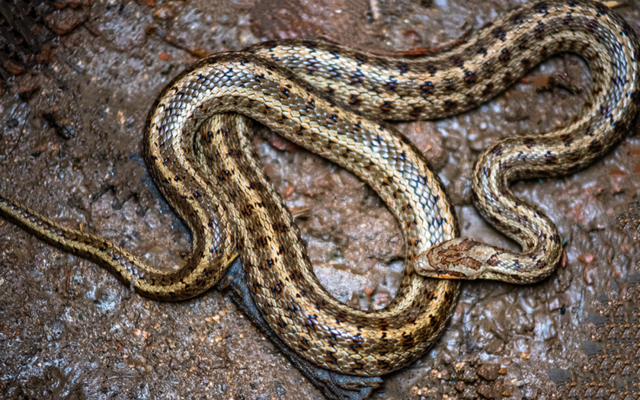 乌梢蛇。史静耸 摄 有3种是管牙类毒蛇,包括短尾蝮、华北蝮、西伯利亚蝮。还有1种具有发达的达氏腺可以引发强烈出血的毒蛇,即虎斑颈槽蛇。